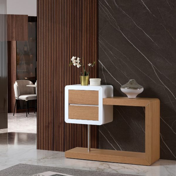 Mesa de Cabeceira com acabamento á cor branco e pormenores em inox.