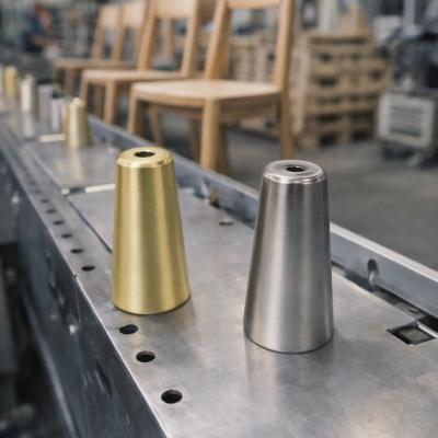 Adicionalmente, disponibilizamos a opção de aplicação de ponteiras em metal nos pés das cadeiras, conferindo um acabamento distinto e maior durabilidade. Esta opção é também sob consulta, podendo implicar ajuste de preço.