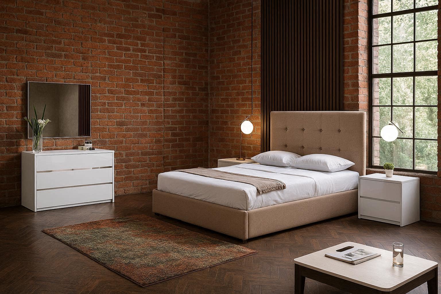Cama com estofo na cabeceira, com estrado para colchão de 1,95x1,50m.