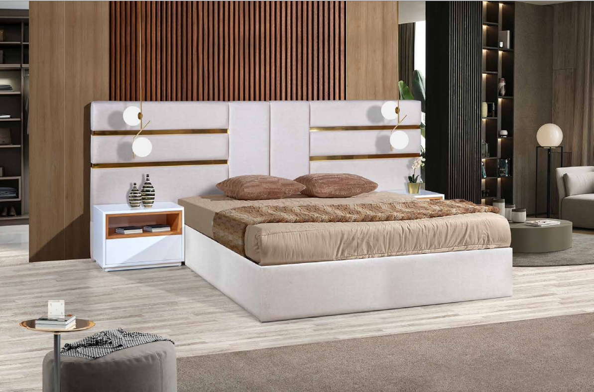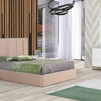 Cama Estofada em tecido classe A, com pormenores na cabeceira em dourado- que podem ser alterado para inox