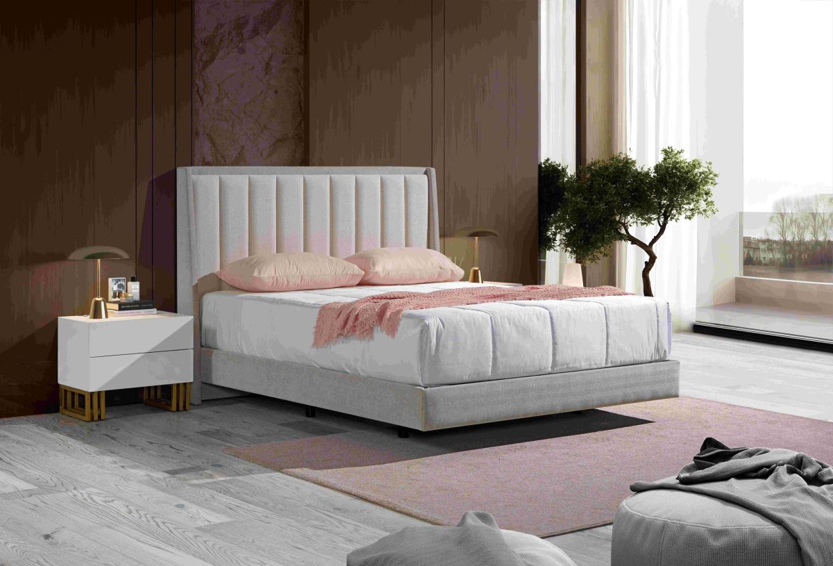 Esta cama, foi desenhada para colchão de 1,95 x 1,50 m, ( mas pode ser ajustada a outras medidas), apresenta uma estrutura contemporânea com cabeceira estofada de linhas verticais, que transmite leveza e requinte ao ambiente. O tecido da cama pode ser totalmente personalizado ao gosto do cliente, permitindo a escolha de diferentes texturas e cores, adaptando-se facilmente a vários estilos de decoração. Medidas especiais também podem ser solicitadas, garantindo uma solução ajustada às necessidades de cada espaço.