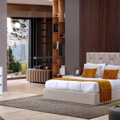 Cama , Estofada em tecido Idris tostado e crema classe A, para colchão 1.95×1.50 ( o estofo da cama pode ser alterado quer na cor, classe ou tipo de tecido e/ou pele)