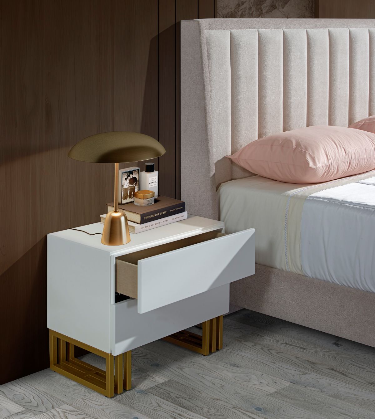 Este quarto destaca-se pela elegância e harmonia dos seus elementos, com especial enfoque na cama e nas mesinhas de cabeceira, pensadas para oferecer conforto e sofisticação.