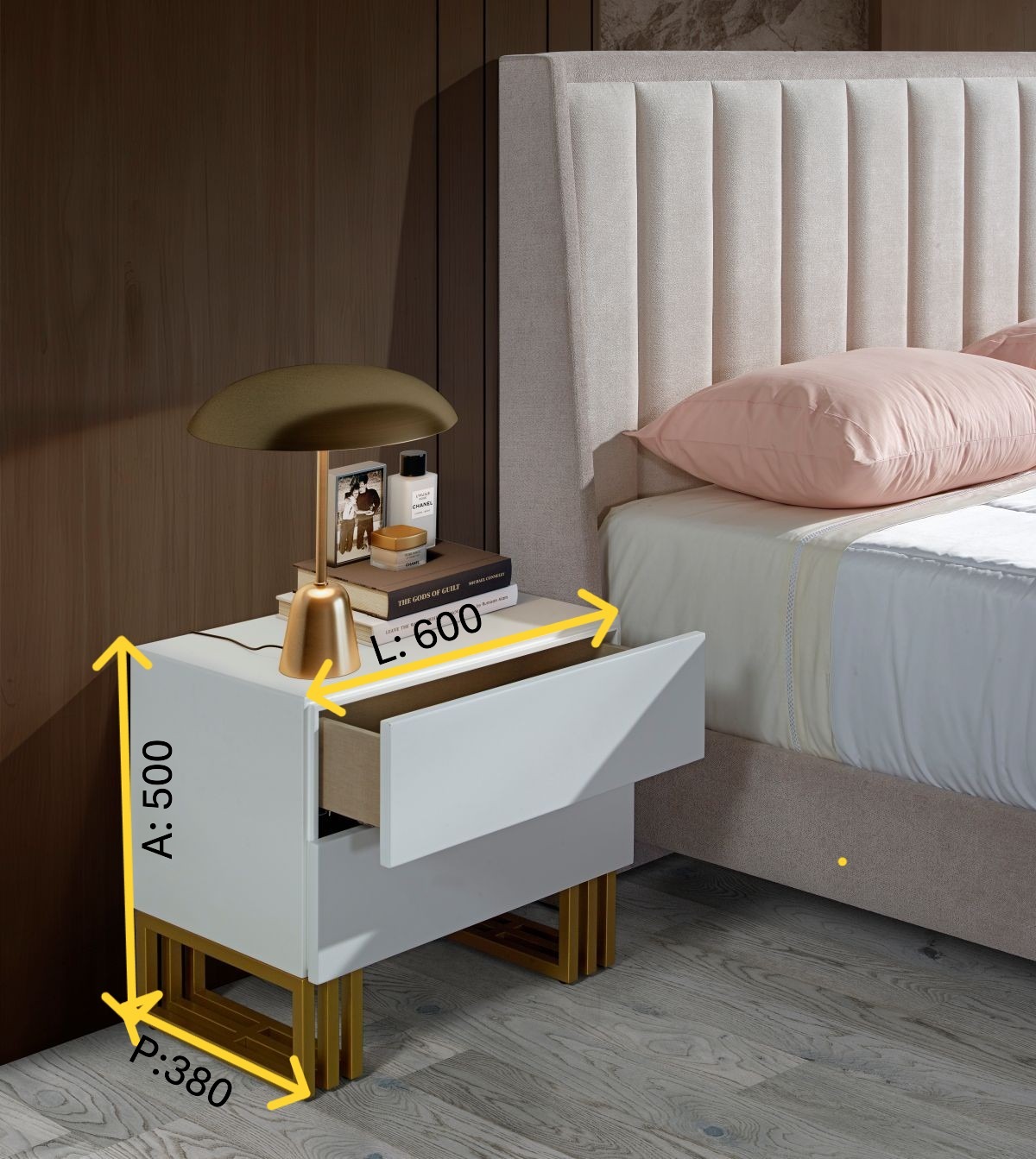 Mesa de Cabeceira com acabamento á cor branco e pormenores em inox. Moldura de Cómoda. (Preço não inclui colchão)Quarto Ref. 12