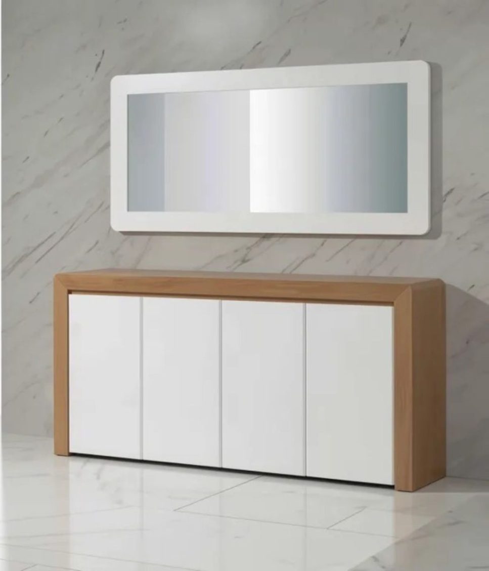 As nossas sala de jantar composta por aparador linhas lisas ligeiramente arredondadas e de 4 portas e com 2 cores, (opcional) com moldura espelhada , a mesa em madeira extensível, com interior do tampo em vidro ( opcional) com pé em madeira maciça, ideal para quem procura aliar elegância, funcionalidade e versatilidade. Com um design contemporâneo e intemporal, adapta-se facilmente a qualquer estilo de decoração — desde ambientes mais modernos e minimalistas até espaços clássicos ou industriais.