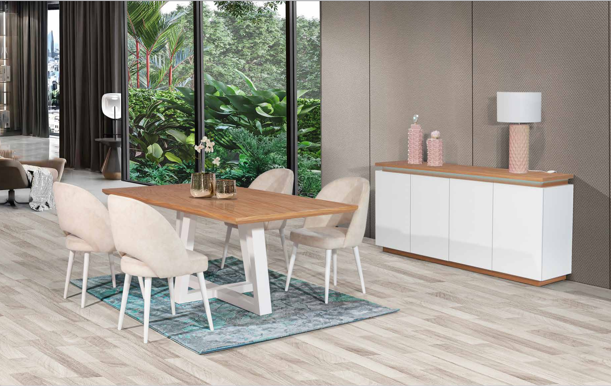 O aparador, com 1950 x 450 x 900 mm (comprimento x profundidade x altura), oferece uma solução prática de arrumação, mantendo a coerência estética do conjunto através da combinação entre superfícies lacadas e detalhes em madeira.